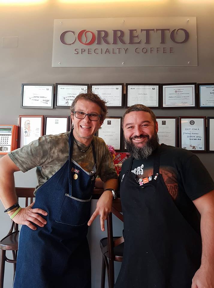 In Mai anul acesta am inceput un nou proiect: Corretto impreuna cu Eugen.Dupa cateva luni de amenajari am reusit sa creionam un spatiu care sa ne reprezinte si in care sa ne regasim. Atmosfera este calda si intima iar echipamentele cu care preparam cafea sunt cele mai bune din Constanta. Am ales un sistem de filtrare al apei care sa ne ofere parametrii cat mai aproape de perfectiune, avem un espressor La Marzocco GB5 custom, un dual boiler ce face preinfuzie, rasnim cafeaua pe o rasnita Eureka Mythos si o Marzocco Volcano, cantarim cafeaua la fiecare extractie, folosim distribuitor pentru a nivela cafeaua din portafiltru si deasemenea utilizam un tamper dinamometric. La extractii folosim doar portafiltrul dublu deci 17 sau 18 gr de cafea din care extragem 45-50ml de espresso. Folosim deasemenea site de dus IMS Competition si site de portafiltru de precizie produse de IMS. Suntem de parere ca te poti apropia de shotul perfect doar fiind ajutat de echipamente de exceptie si de o cafea prajita corect.